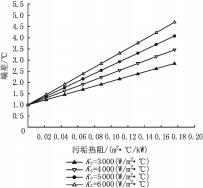 假設冷凝器的冷卻水進出水溫差為5℃,冷卻水側換熱表面清潔時冷凝器端差為1℃,即傳熱溫差為3.5℃。圖2顯示了冷凝器清潔狀態下傳熱系數Kc不同時污垢熱阻對端差的影響,Kc越大,污垢熱阻對端差的影響越顯著。