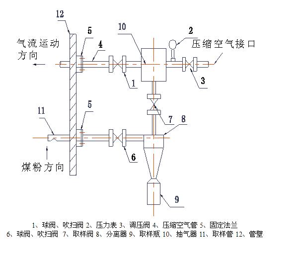 4、取樣閥——飛灰取樣時,將此閥打開,靠壓縮空氣由出氣口排氣形成的氣流,抽吸分離器中的空氣,使其形成負(fù)壓,飛灰從取樣口進(jìn)入取樣裝置,進(jìn)行取樣。