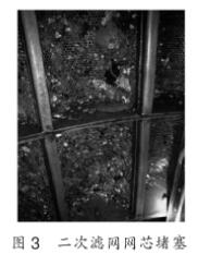 (3)膠球清洗二次濾網(wǎng)網(wǎng)芯孔徑過小,僅為中8mm,運行過程中垃圾極易造成網(wǎng)芯的堵塞(圖3)。在夏季垃圾.較多時期,每臺膠球清洗二次濾網(wǎng)平均每兩.周需要清理一次。當(dāng)膠球清洗二次濾網(wǎng)隔離人工清理時,凝汽器鈦管水側(cè)出現(xiàn)斷水,在凝汽器汽側(cè)汽流沖擊下?lián)Q熱管束的振動增大,造成管束和管板間磨損。另外,隔離時鈦管會出現(xiàn)溫度升高現(xiàn)象,致使鈦管膨脹加長。由于兩側(cè)管板間距變化較小,鈦管膨脹加長后會產(chǎn)生拱起彎曲,與管隔板間的磨損加劇。上述因素極易造成鈦管的磨損穿孔,致使凝汽器出現(xiàn)泄漏,影響機(jī)組整個汽水系統(tǒng)的安全。