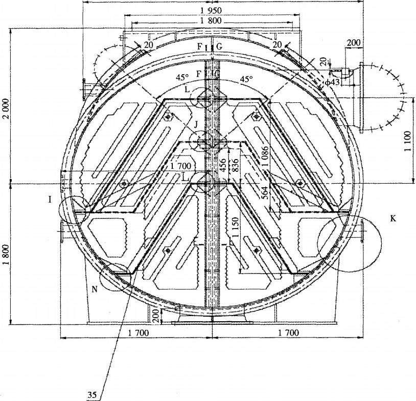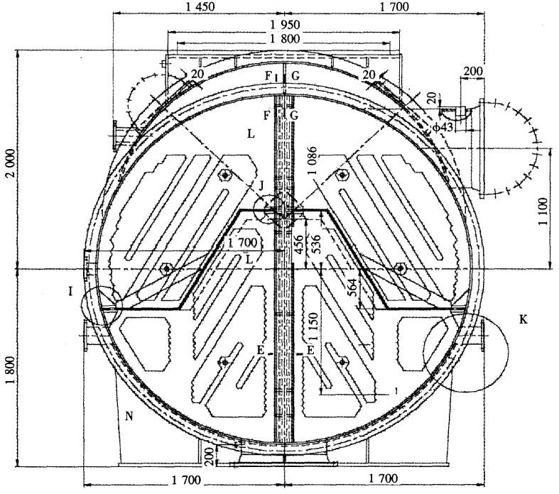 圖1小機(jī)凝汽器水室隔板改造前示意圖(單位:mm)進(jìn)行調(diào)研分析。通過現(xiàn)場檢查,認(rèn)為造成收球率較低的主要原因有以下幾點(diǎn):