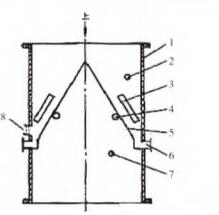 4改造后的A形雙箭式收球網縱剖面結構注:1捕環水管管壁;2網前測壓點;3導流.板.;4軸;5網板;6脫球引出管;7網后測驗點;8觀寨孔
