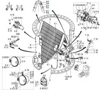 收球網狀態為關閉狀態,結構包括收球網本體、電動執行器、軸承、收球網支架、收球管道、閥門、差壓變送器和密封墊等部件,正常運行時收球網是打開的,而投球及收球狀態下收球網是關閉的,防止膠球漏至長江。
